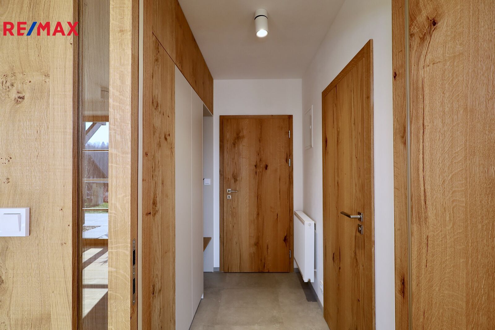 V obytné místnosti je na podlaze položena dřevěná dubová podlaha s jemně drásanou strukturou. Stejný materiál je použit i jako obložení částí stěn a stropu ve spací části. Strop je kombinací zmíněného obložení a sádrokartonu s tepelnou a zvukovou izolací o tloušťce 5 cm. Kuchyňská linka je vybavena spotřebiči Electrolux – indukční varná deska, myčka, lednice s mrazákem, multifunkční trouba. Dřez i baterie jsou značky Franke. Pracovní deska je z umělého kamene a kování skříněk a šuplíků je použito od firmy Blum v nejvyšší třídě. V předsíni je velmi prostorná skříň v kombinaci drásaného dýhovaného dubu a lamina. Zajímavostí je, že tato skříň je přístupna i ze spací části, kde je velmi prakticky umístěna velká manželská postel s dalšími úložnými prostory. Dlažba v předsíni a koupelně společně s obkladem je s šedivým tónem ve formátu 60×60 cm, stěna za zrcadlem s obkladem s imitací dřeva ve formátu 20×120 cm. Podomítkové baterie ve sprchovém koutě i umyvadle jsou od firmy Grohe. WC je geberit s toaletou Laufen. Osvětlení v kuchyni je z LED pásků, dále jsou použity bodová LED světla Rendl light studio typ Condu. Vnitřní dýhové dveře dub rustikal, od společnosti Sapeli jsou bezfalcové s magnetickými zámky. Velmi krásným designovým kouskem jsou dveře do obývací části, které jsou obloženy tvrzeným bezpečnostním sklem (8,8 mm), máte tedy pocit, že dveře v prostoru doslova levitují, navíc prosklení dodává do předsíně denní světlo. Okna jsou dřevěná Euro s izolačním dvojsklem. Vytápění zajišťují radiátory s možností ovládání přes mobilní telefon.
