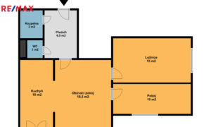 Plocha bytu je 62 m2, sklepní kóje 2 m2, balkon 1 m2.