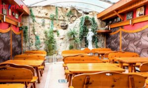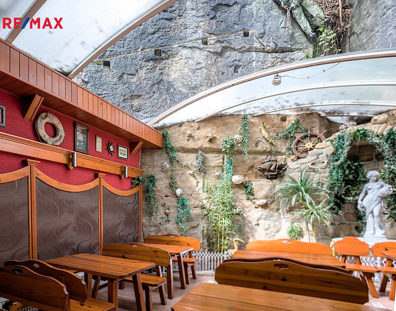 Restaurace v přízemí spolu se zimní zahradou nabízí místo pro 88 hostů. Je zařízena kvalitními dubovými stoly s židlemi, dobovými obrazy a dekoracemi, které hosty jistě zaujmou. Ve vytápěné zimní zahradě je začleněna skála, v níž je hotel usazen, což dotváří jedinečnou atmosféru tohoto místa.