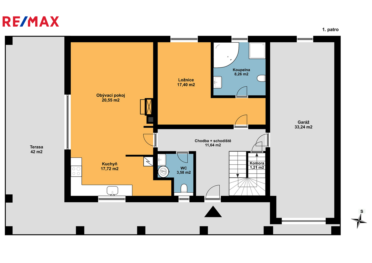 1. patro čítá plochu 155,6 m² kde vás uvítá reprezentativní vstupní hala. Po celé ploše spodního patra je položena italská dlažba 60×60 ve které je aplikováno podlahové topení. Z hlavního vstupu či vstupu z obývací prostoru vás uvítá rozlehlá terasa o výměře 42 m². V daném patře se nachází koupelna s rohovou vanou vč. toalety a toaletou pro hosty.