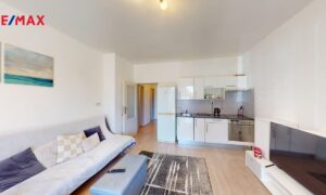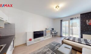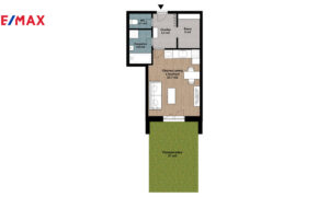 Bytová jednotka s prostornou obývací místnost s kuchyňskou linkou s přímým vstupem na vlastní terasu se zahrádkou, která vás nadchne hlavně v létě, kdy je možno relaxovat, zahradničit nebo třeba grilovat.
