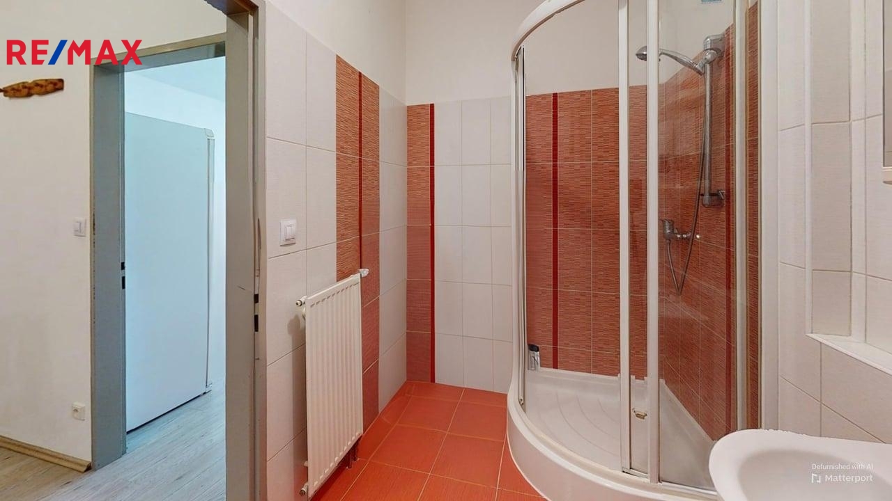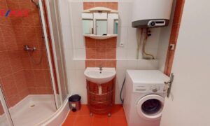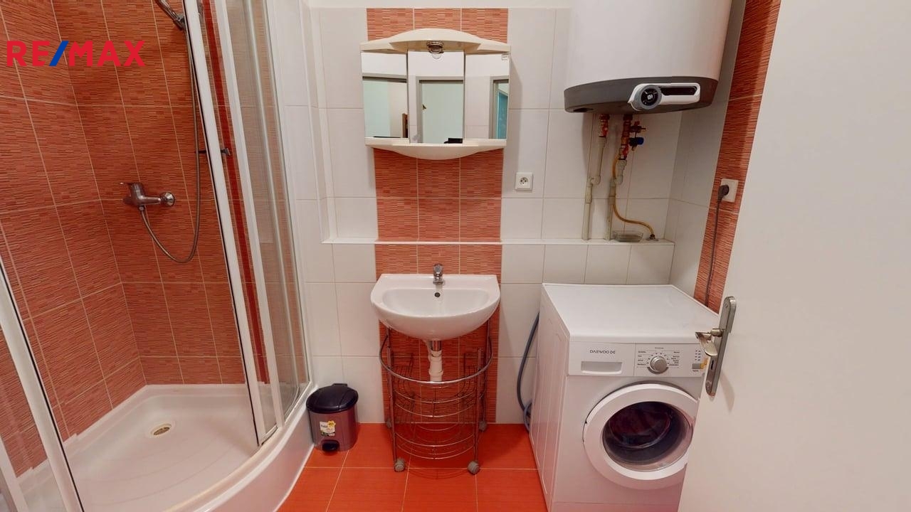 Prostorná koupelna s vanou a místem na pračku, WC samostatné. Topení: vlastní elektrokotel přímo v bytě, ohřev vody bojler. Nízké měsíční náklady na bydlení (cca 1.900,-Kč služby vč. fondu oprav + elektřina na byt). Orientace bytu na východ.