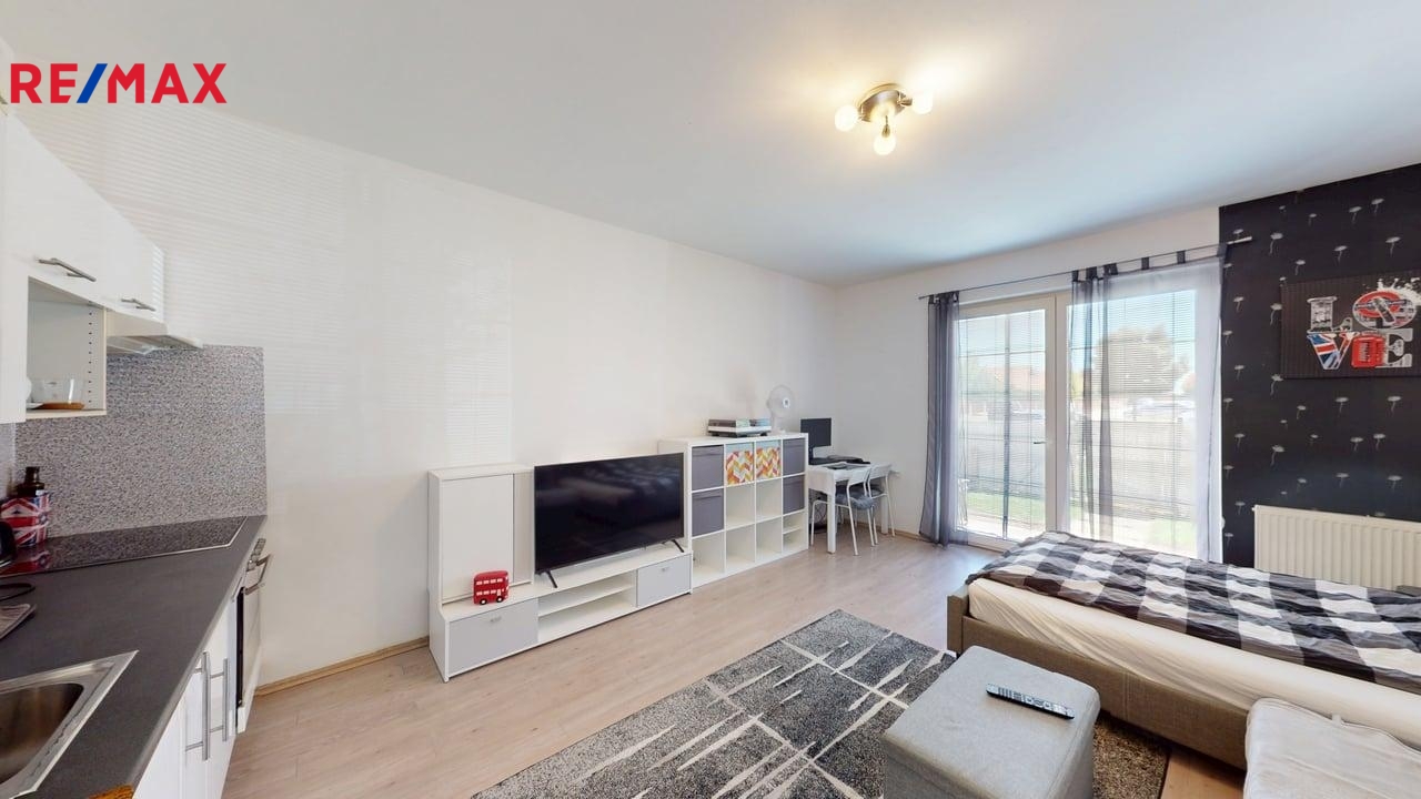 Prodej prostorného bytu 1+kk se zahrádkou a parkováním, Holubice – Kozinec, spojení na metro