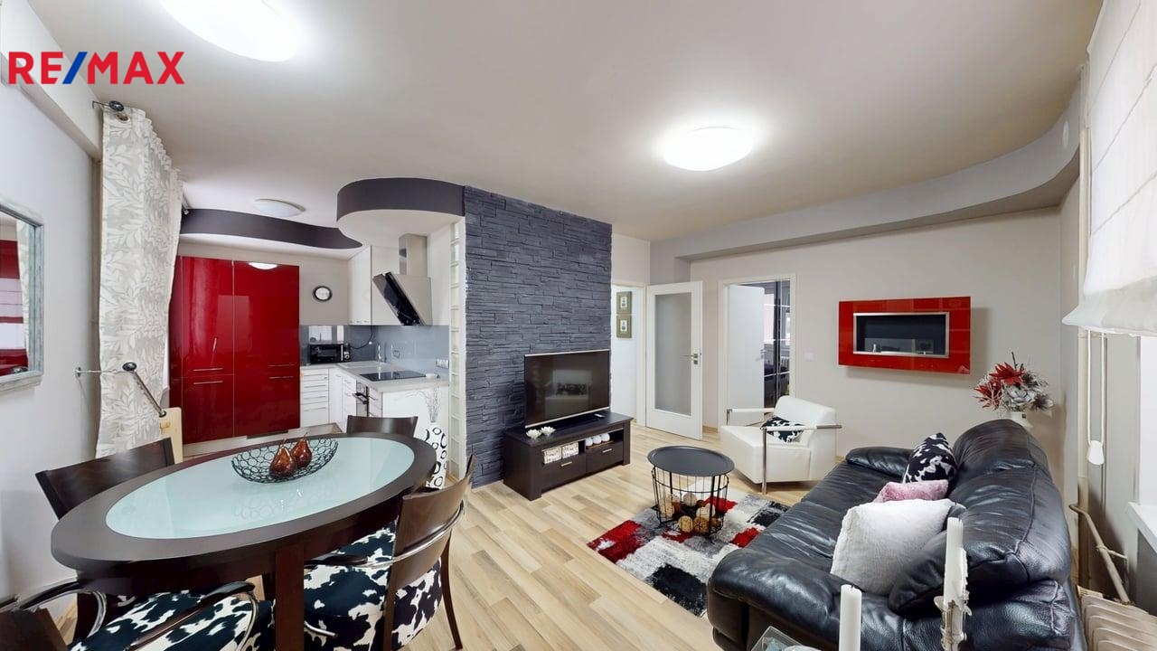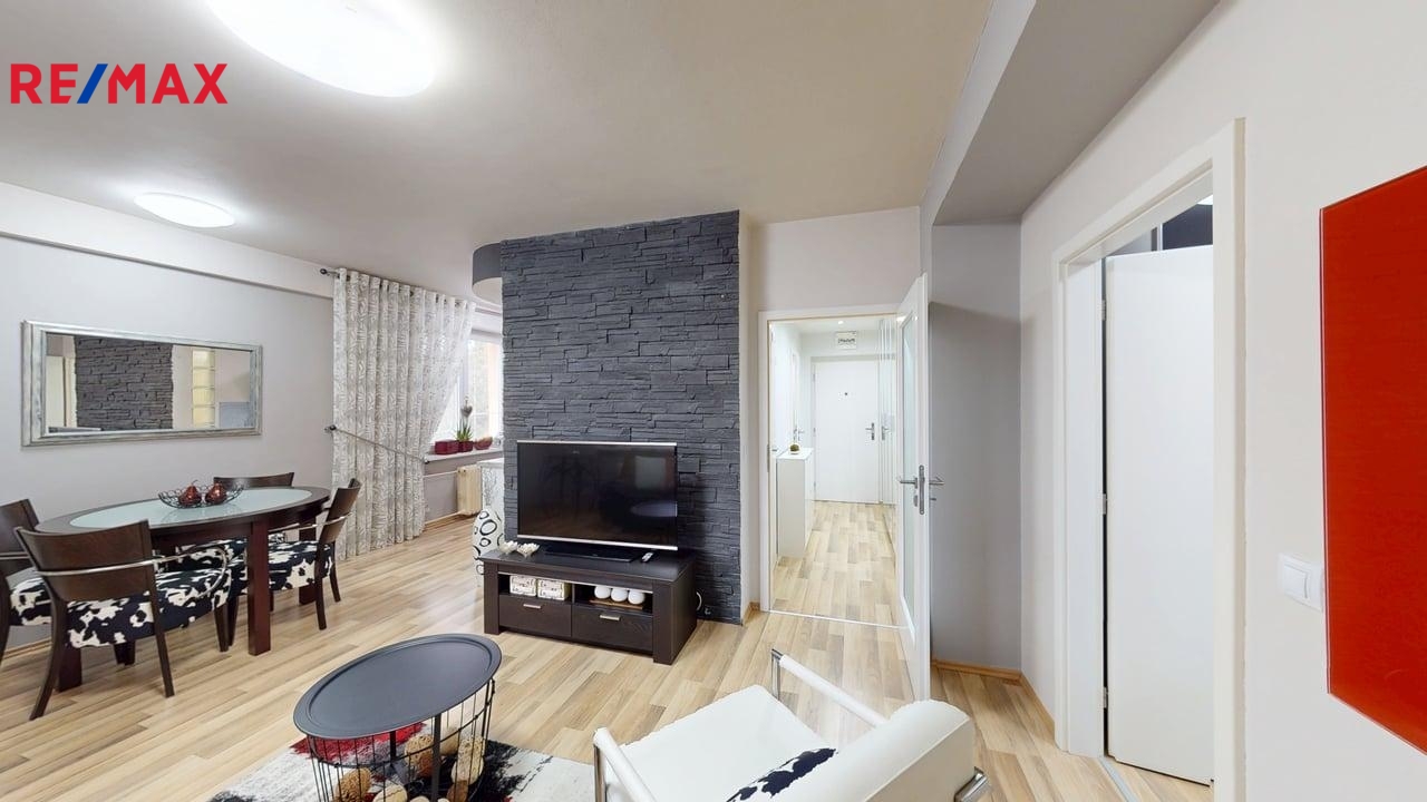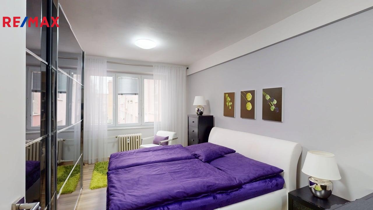 Užitná plocha bytu činí 52 m², což zahrnuje dobře řešený obývací pokoj s kuchyňským koutem, ložnici a koupelnu s vkusnými nadčasovými obklady a koupelnovými nábytkem. WC je odděleno zvlášť od koupelny, obklady ve stejném stylu jako v koupelně, je zde malé umyvadlo a také pračka nad níž si místo polic může nový majitel či majitelka umístit i sušičku. V předsíni se nachází praktická vestavná skříň se zrcadly, v ložnici taktéž další velká skříň a postel s nábytkem, jak je vidět na fotografiích. Kuchyňská linka s digestoří s odtahem par ven, varnou sklokeramickou deskou, elektrickou troubou, myčkou, lednicí, mikrovlnnou troubou.