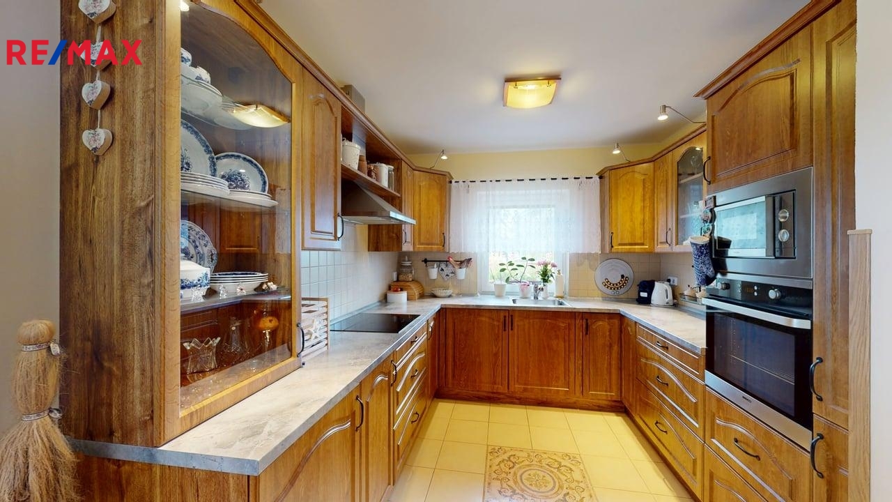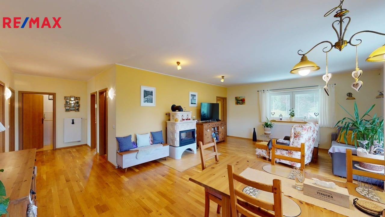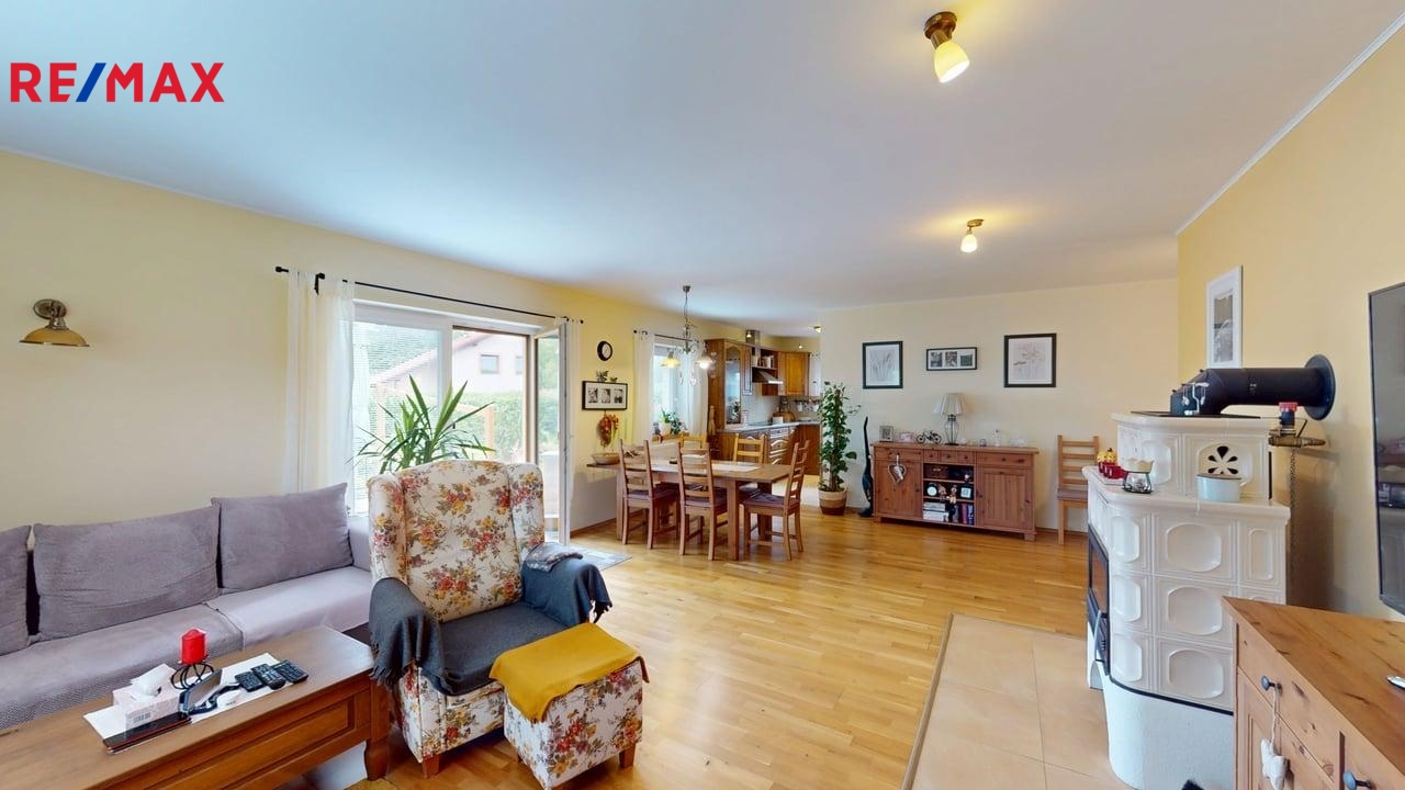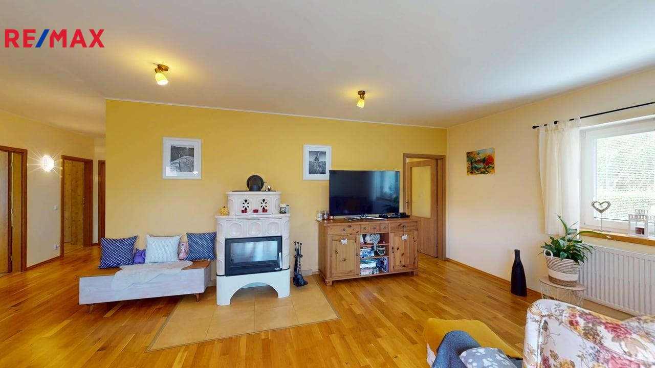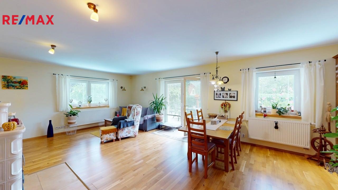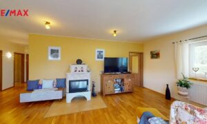 • Prostorný obývací pokoj s krbovými kamny a oddělenou kuchyní (cca 42 m²)