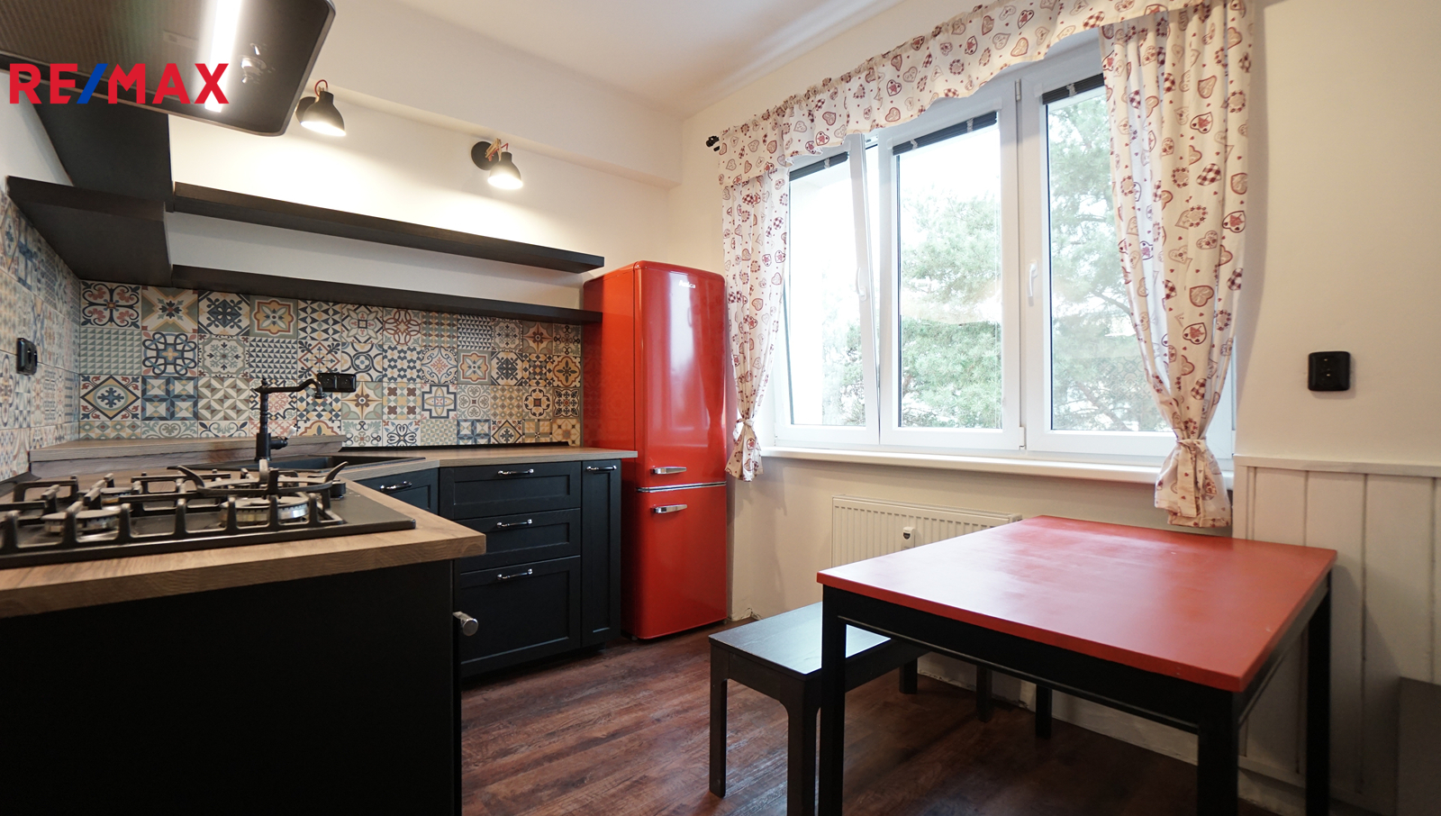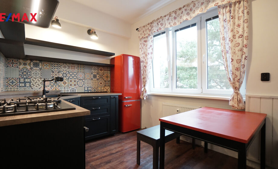 Vybavení kuchyně — Lednice, plynový sporák, el. horkovzdušná trouba a digestoř. Okna jsou plastová opatřena žaluziemi. Ohřev vody a vytápění je řešeno dálkově. U vstupu do bytu je vestavěná skříň, která disponuje spousty úložnými prostory.