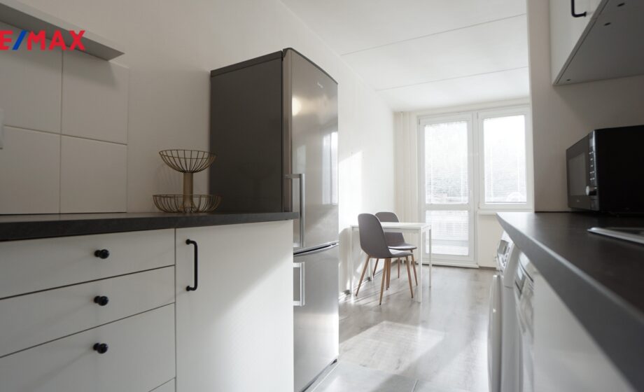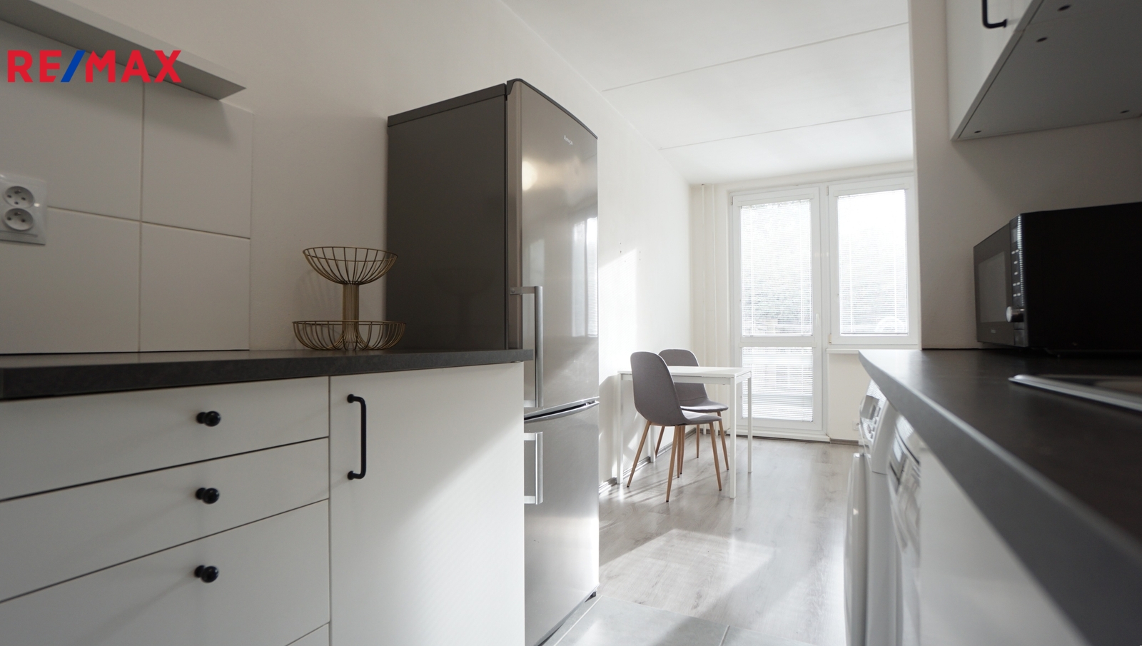Součástí bytu je plně vybavená kuchyň – lednice, trouba, digestoř, myčka, mikrovlnka a sklokeramická deska. Dále pračka. K dispozici je i nábytek, který je zachycen na fotografii. Okna jsou plastová, opatřena žaluziemi. Orientace oken je jižní.