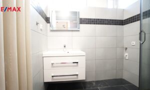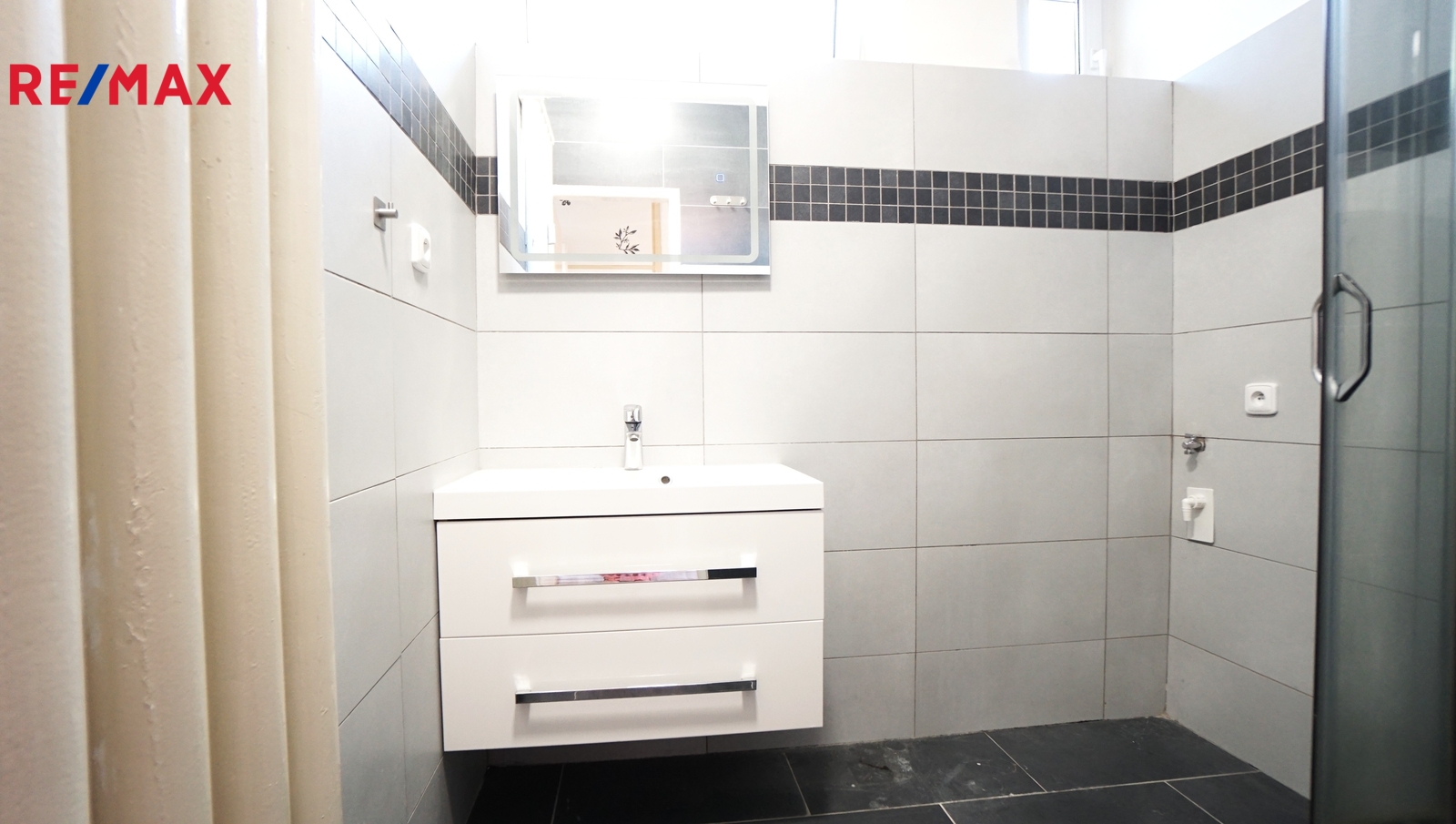 Koupelna disponuje sprchovým koutem, umyvadlem se skříňkou a osvětleným zrcadlem. Je zde prostor na pračku. Toaleta je oddělena.