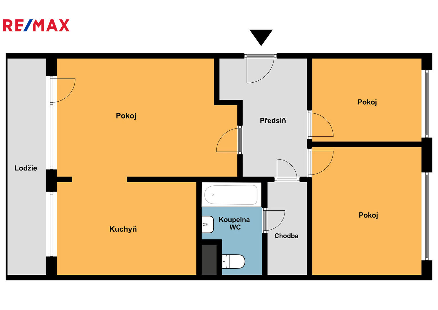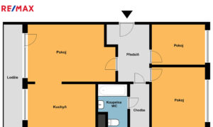 Byt má obývací pokoj propojený s kuchyní, dvě ložnice, koupelnu s toaletou a vstupní chodbu.