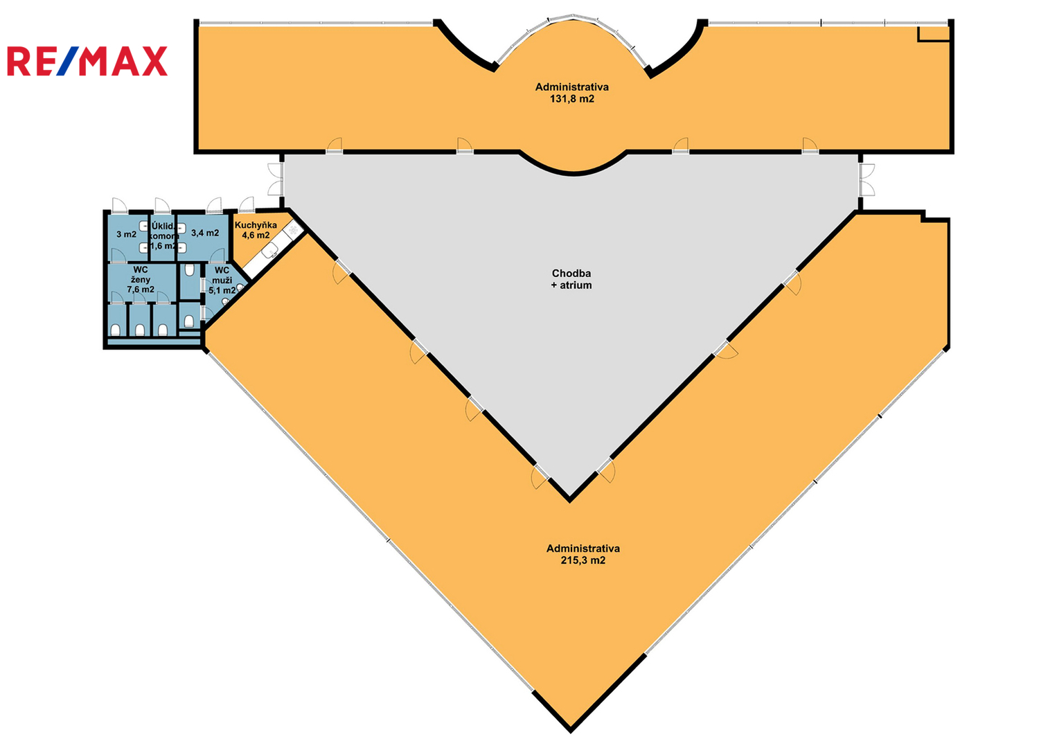 Prostor tvoří tvar trojúhelníku kolem středové části, která je otevřená až do přízemí budovy. Kanceláře jsou doplněny skladem, sociálním zařízením a kuchyňkou.