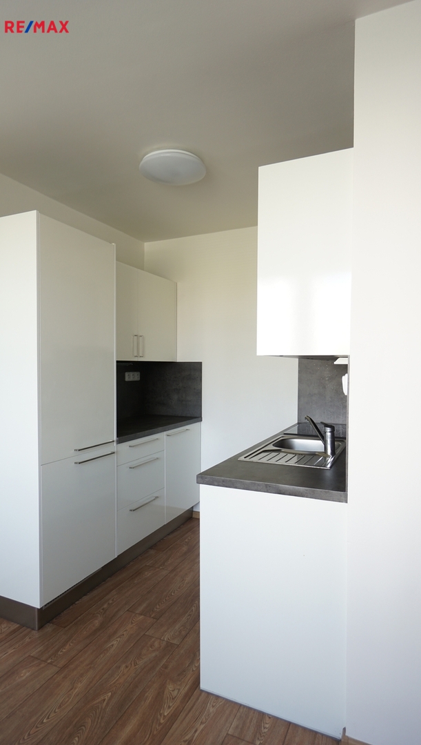 V kuchyni je zabudovaná lednice, elektrická trouba, varná deska, dřez a digestoř. V lince je také vývod na pračku, která není součástí vybavení. Byt je pronajímán nezařízený.