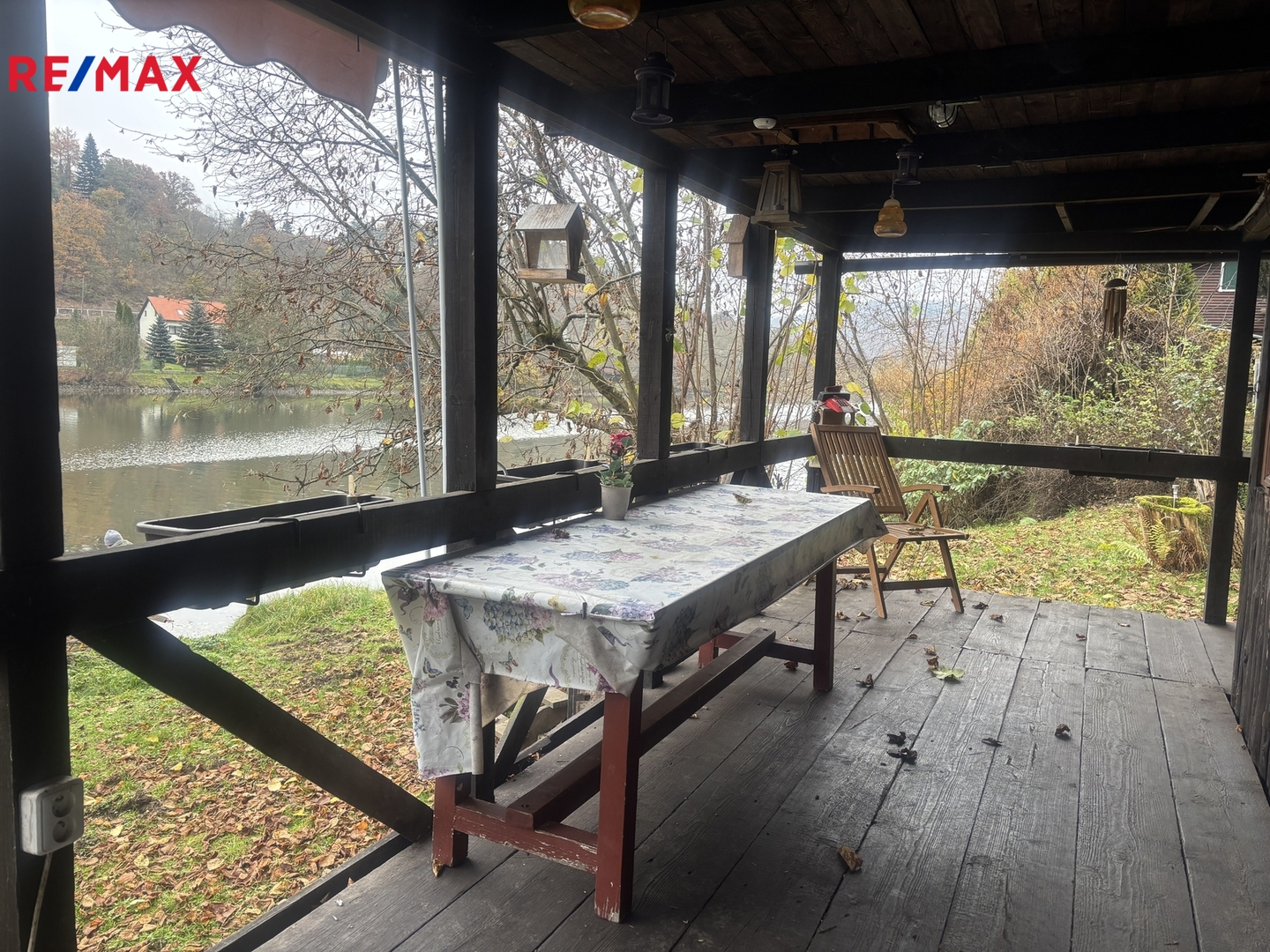 Pod chatou je velkorysý prostor na nářadí a umístění plynové bomby, kolem prostor pro klidné posezení, zahradní sprchu a ranní kávu s výhledem na řeku, kterou si můžete vychutnat na terase o výměrě 20m2.