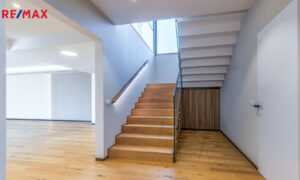 Vila je umístěna na hranici mírně svažitého pozemku s ideální jižní orientací. Ve vstupním patře se nachází reprezentativní vstupní hala, 3x ložnice, 2x koupelna, 2x šatna. Přízemí domu tvoří velkorysý obývací prostor (70m2) s krbem a kuchyňský koutem, dvě ložnice, koupelna, šatna, wc. Kromě velkoformátových posuvných okenních stěn přivádí do prostoru denní světlo i světlovody v kombinaci s osvětlením. Na obývací pokoj přímo navazuje venkovní terasa 37m2, zastřešená el. ovládanou skleněnou pergolou a dálkově ovládaným systémem zastínění. Terasu lze alternativně úplně uzavřít a vytvořit z ní pasivní zimní zahradu, díky systému posuvných skel. Na terase je příprava na připojení televize a přípojná místa pro venkovní kuchyni.