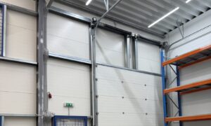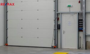 Vjezdová vrata sekční – 4000x4200mm s el. pohonem. Příprava pro zabezpečovací zařízení a protipožární čidla.