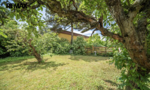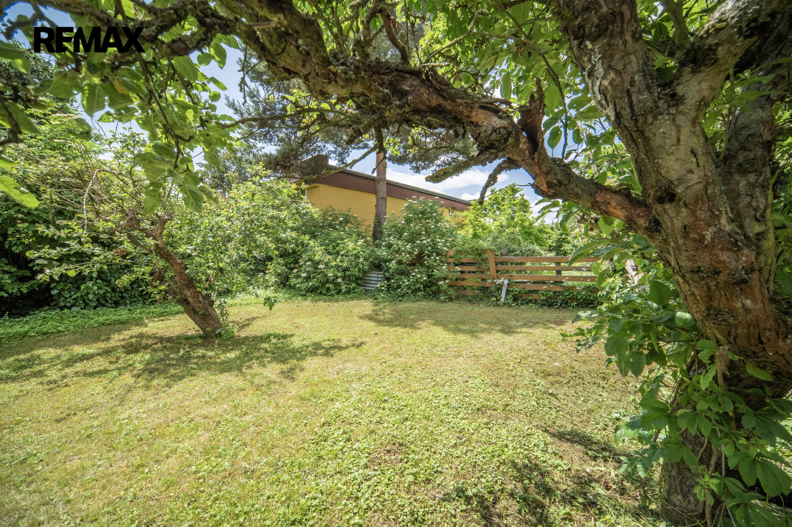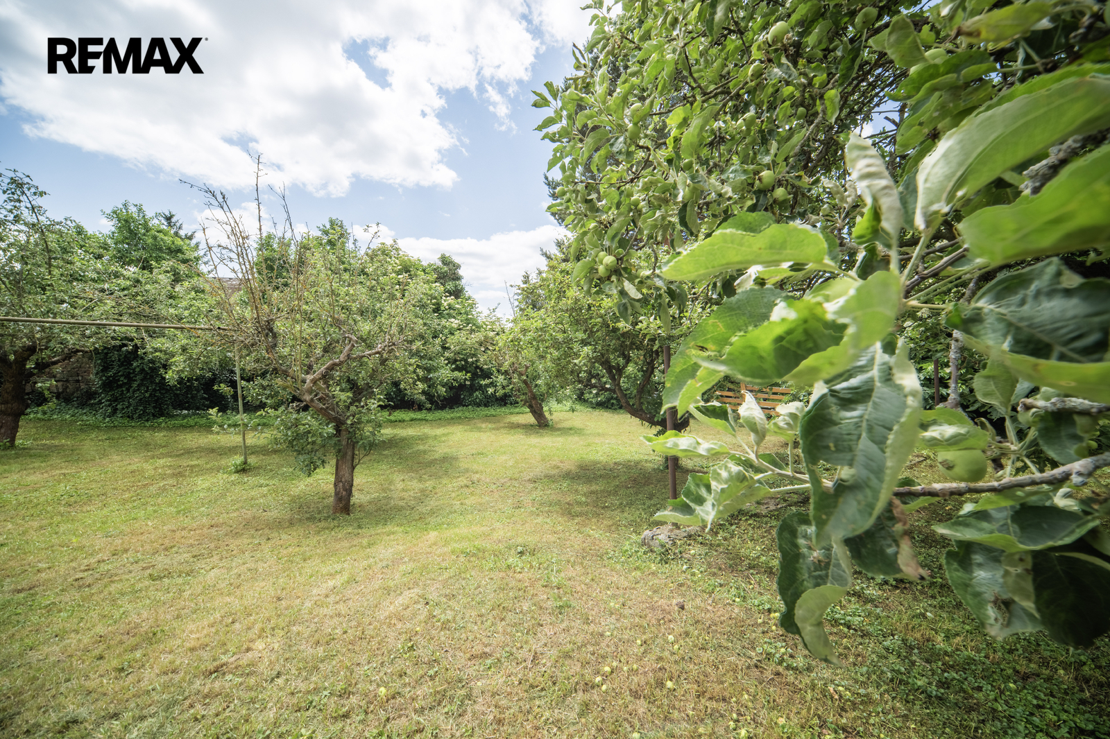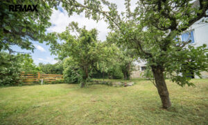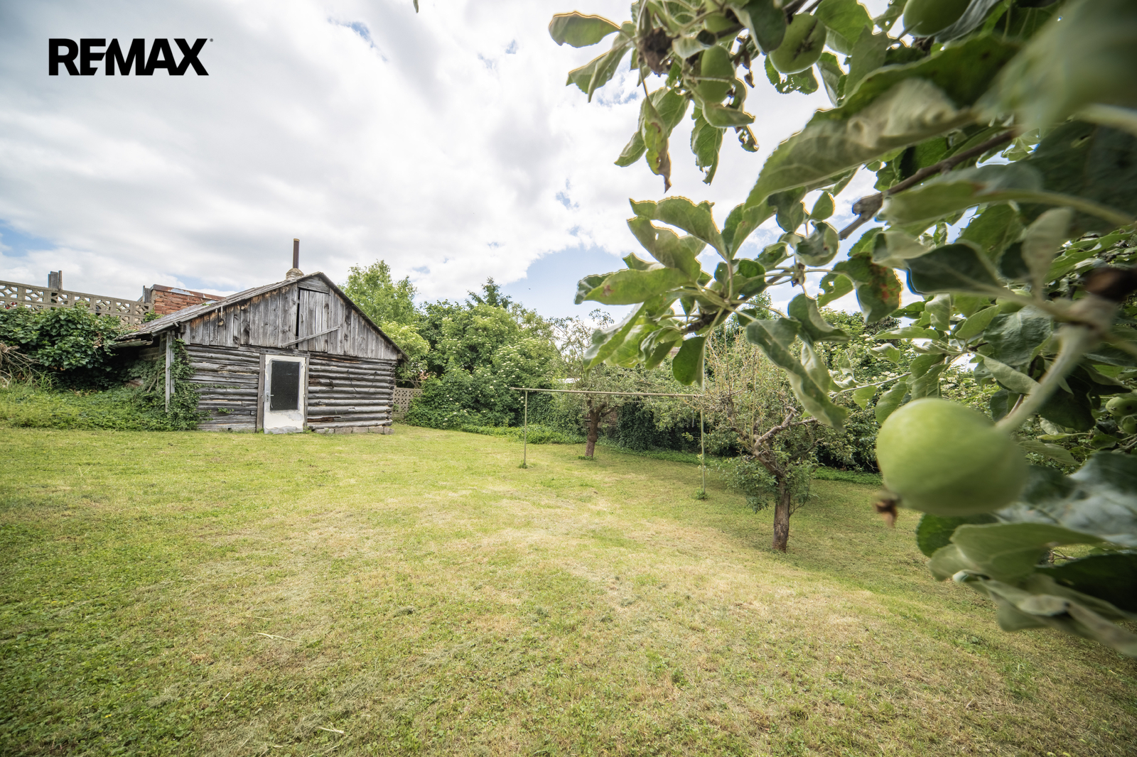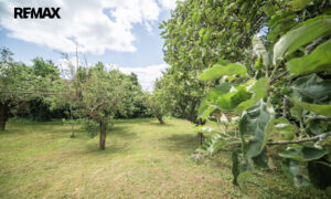 Pozemek je oplocený, jsou na něm vzrostlé ovocné stromy a starší zahradní domek.
