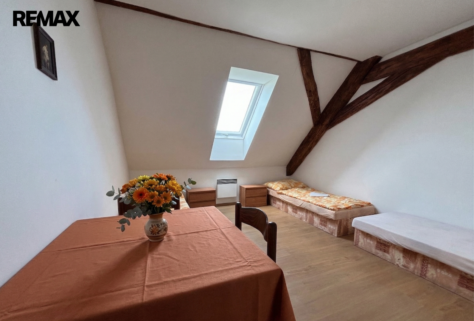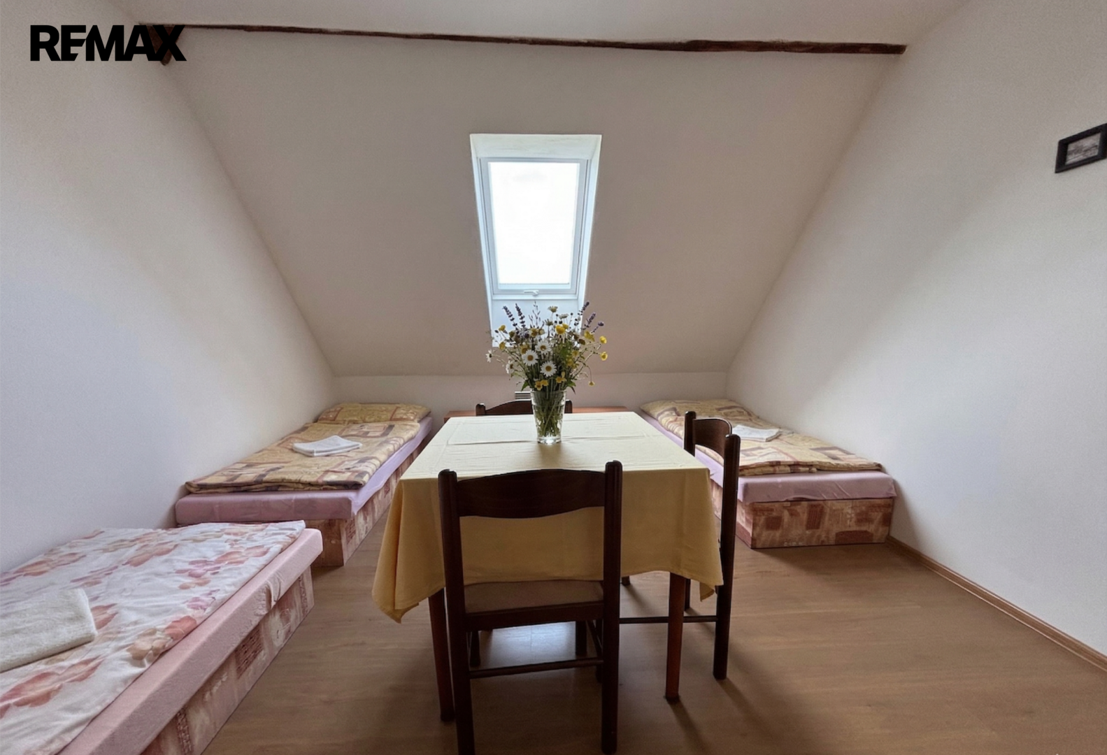 Podkroví je kompletně vybudováno pro účely ubytování. Penzion má aktivní historii na portálu Booking.com a ideální kapacitu pro ubytování svatebčanů, turistů i cyklistických zájezdů. Můžete plynule navázat na stávající rezervace.